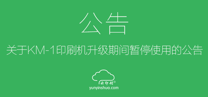 ? ? ? 您好!云印刷生產(chǎn)中心的柯尼卡美能達(dá)KM-1噴墨印刷機(jī)將于5月18日-6月3日期間進(jìn)行軟件系統(tǒng)和硬件設(shè)備升級,升級期間將暫停使用,屆時(shí)所下的訂單將安排至其他印刷機(jī)進(jìn)行生產(chǎn),如給您造成不便敬請諒解!
